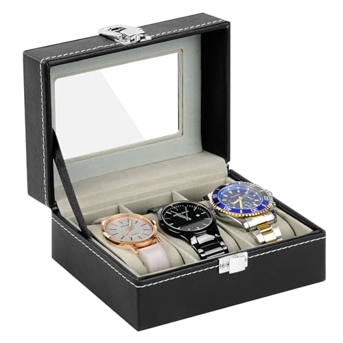 OFFCUP Boîte à Montres à 3 Emplacements, Coffret à Montre en PU, Écrin à Montre avec Couvercle en Verre, Amovibles Coussinets Boîte de Rangement pour Montres Bijoux Femme Homme, Noir