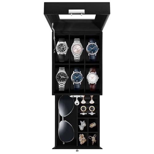 H&S Boîte de Rangement Montre pour Femme ou Homme - Boite a Bijoux en Simili Cuir Noir, Couvercle en Verre & Coussin en Velours - Contient Jusqu'à 10 Montres - Idée Cadeau Original