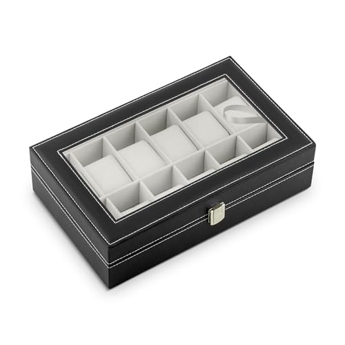 Uten Boite a Montre, 10 Emplacements Écrin à Montres en Cuir Boite Rangement Montre avec Couvercle en Verre pour Homme Femme Noir