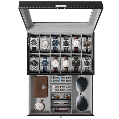 Uten Boîte à Montres, 12 Compartiments Écrin à montres, Vitrine de Montres pour Hommes, Boîte de Rangement pour Montres avec Coussin Amovible