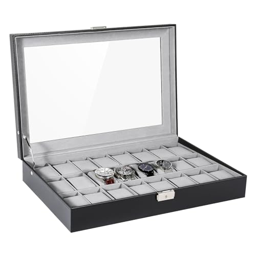 Uten Boite a Montre, 24 Emplacements Écrin à Montres en Cuir Boite Rangement Montre avec Couvercle en Verre pour Homme Femme