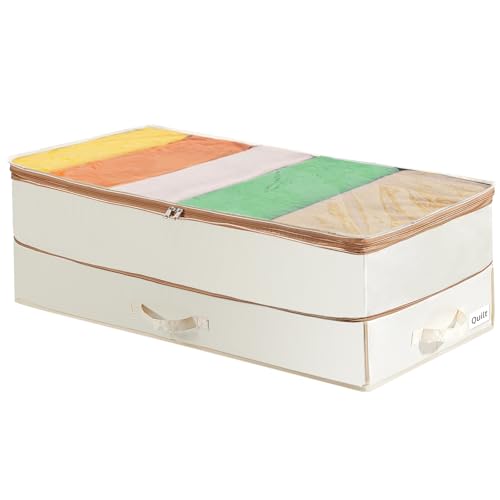 JUBORUI 2 Étage Boite Rangement sous Lit 56-96L, Sac de Rangement Sous Lit avec Fenêtre Transparente Poignée Renforcée pour Couettes, Draps, Vêtements, Couvertures,Oreillers (Beige)