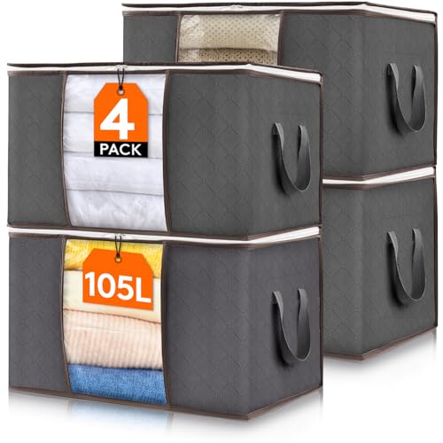 Lifewit Sac de Rangement Vetement, Boite Rangement Pliable, Rangement Sous Lit, Housse Rangement Couette pour Vêtements, Couvertures, Demenagement, Gris, 105 L, Lot de 4