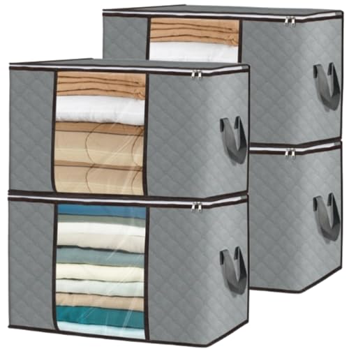 Lifewit Lot de 4 Sac de Rangement Vetement 35L, Boîte de Rangement Sous lit Pliable, Housse Rangement Couette Organisateur de Placard, Fenêtre Transparente en Tissu Solide pour les Vêtements, Gris