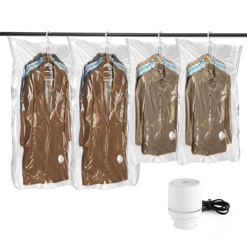 Flintronic Sac Sous Vide Vetement Aspirateur avec Pompe électrique, Lot de 4 Sacs de Rangement Suspendu pour Vêtements Sous Vide,Rangements Vêtements pour Placards et Penderie,Transparent Réutilisable