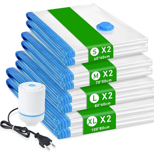 Lot de 8 Sacs Sous Vide pour Vêtements avec Pompe, Sacs de Rangement Compressibles XL/L/M/S pour Couettes, Housses et Habits, Étanches et Gain de Place pour Voyage, Maison et Déménagement