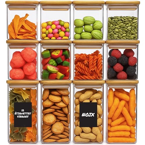 Deco haus® Bocaux de Conservation 12 pcs avec Couvercles + Étiquettes [HERMÉTIQUES] - Pour Céréales, Cornflakes, Spaghetti - Boîtes en Verre - Boîte Rangement Cuisine - Bocaux de Stockage