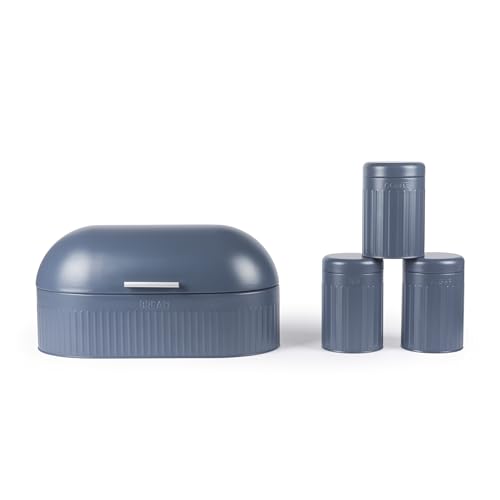 Ensemble de rangement de cuisine 4 pièces Progress Mellow – Boîte à pain et boîtes à thé, café, sucre, finition bleue revêtue par poudre, lettres embossées, ensemble pour plan de travail
