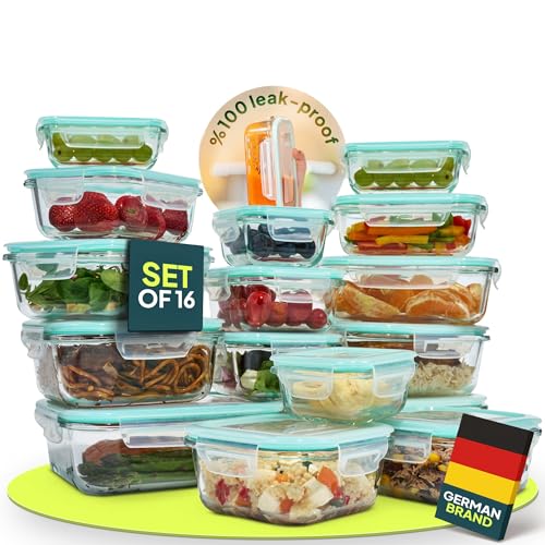 uandu Boîte Conservation Verre 16 Pièces – Boite en Verre avec Couvercle Alimentaire, Boîtes Alimentaires Hermétiques, Boite Rangement Cuisine, Meal Prep, Four & Congélateur
