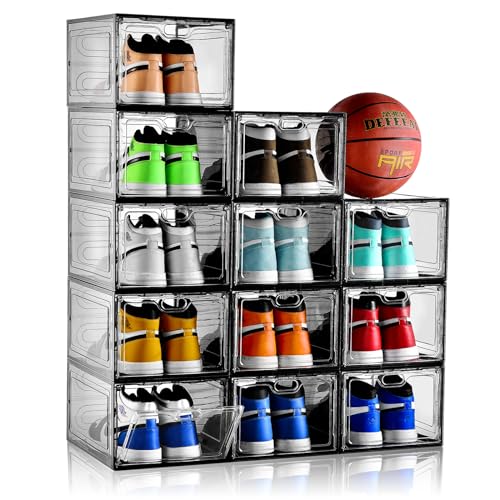 BAKAJI Lot de 12 boîtes à chaussures empilables avec couvercles, assemblage facile, porte-chaussures de gain de place transparentes, boîtes de rangement de rangement, (lot de 12 pièces, 33,5 x 23 x