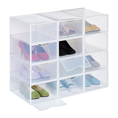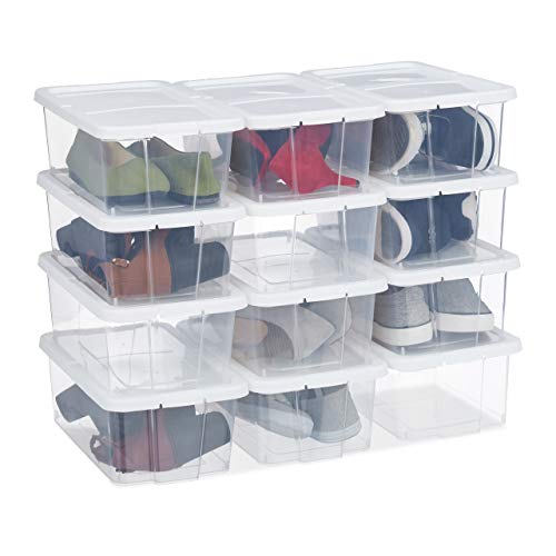 relaxdays Boîtes à Chaussures en Plastique, Lot de 12, empilable, Transparents couvercles, 12,5 x 20 x 34,5 cm, Blanc