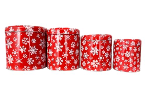 Brandsseller Lot de 4 boîtes de Noël rondes en métal - Boîtes à biscuits pour biscuits, pâtisseries et cadeaux - Design festif - Convient à un usage alimentaire - Empilables - Rouge - Étoiles glacées