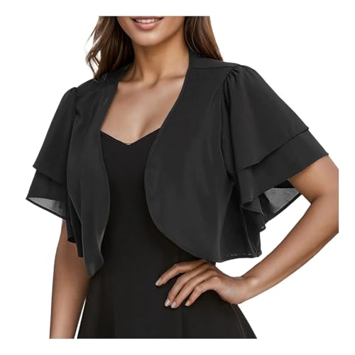 CuLtP boléro cérémonie Boléro Court en Mousseline De Soie pour Femme Veste Légère D'Été Cardigan Transparent Double Couche À Volants Manches Courtes Chemisier Robes De Soirée Châle Noir XXL