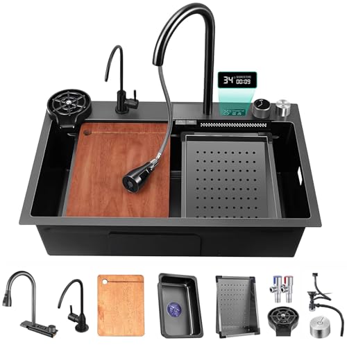 IROEJT Lavabo encastré Moderne en Acier Inoxydable 304, Effet Cascade, Gris foncé, 75 x 45 cm, 3 Trous, bonde clic-clac. Meuble-lavabo élégant et Facile à Nettoyer.
