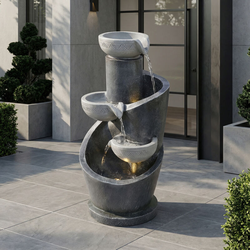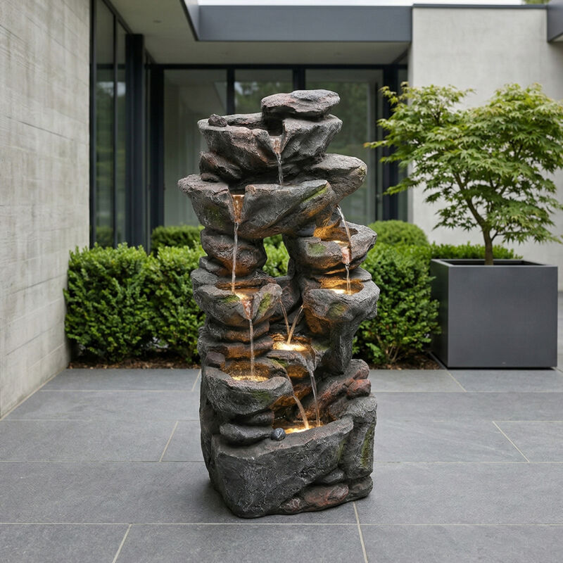 Fontaine de jardin avec éclairage LED et pompe à eau, aspect pierre naturelle, résine grise, pour terrasse