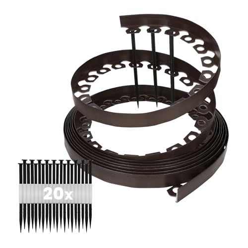 GARDENIX Bordure de pelouse Flexible en Plastique - Résistante aux intempéries - Bordure Ronde - Bordure de Parterre de Fleurs - Marron - 10 m - 20 piquets - Hauteur : 10 cm