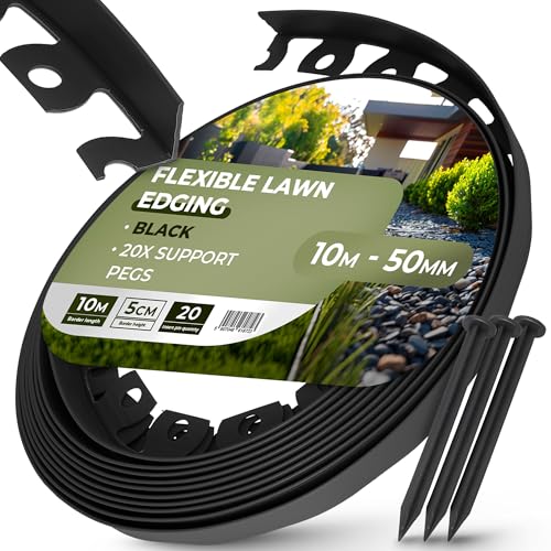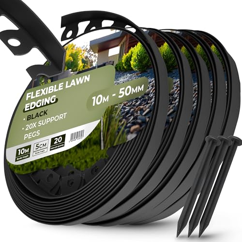 JUOIFIP Bordure Jardin Plastique 10 mètres, Bordure de Jardin Flexible 5 cm avec 60 Piquets, Bordure de Pelouse Noire pour Gazon, Massifs, Allées, Bordure Souple Jardin, Installation Facile