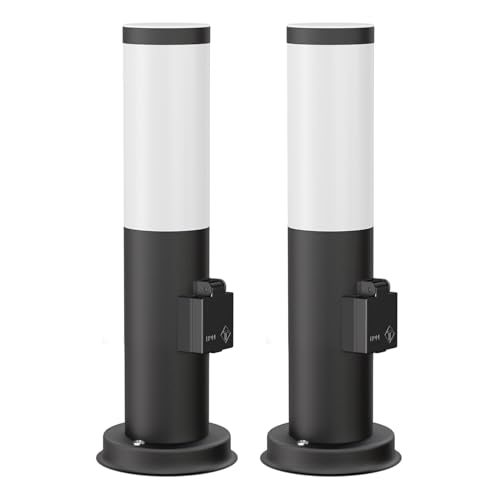 ledscom.de 2 pièces Borne d'éclairage PORU avec prise de courant pour l'extérieur, noir, rond, 38,5cm, ampoule E27 incluse, 471lm, blanc extra-chaud