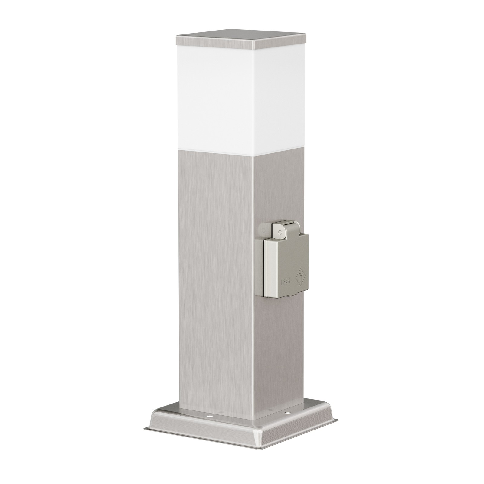 ledscom.de Borne d'éclairage PORU pour l'extérieur, IP44, 39 cm, inox, 1x E27 max. 40W, prise de courant