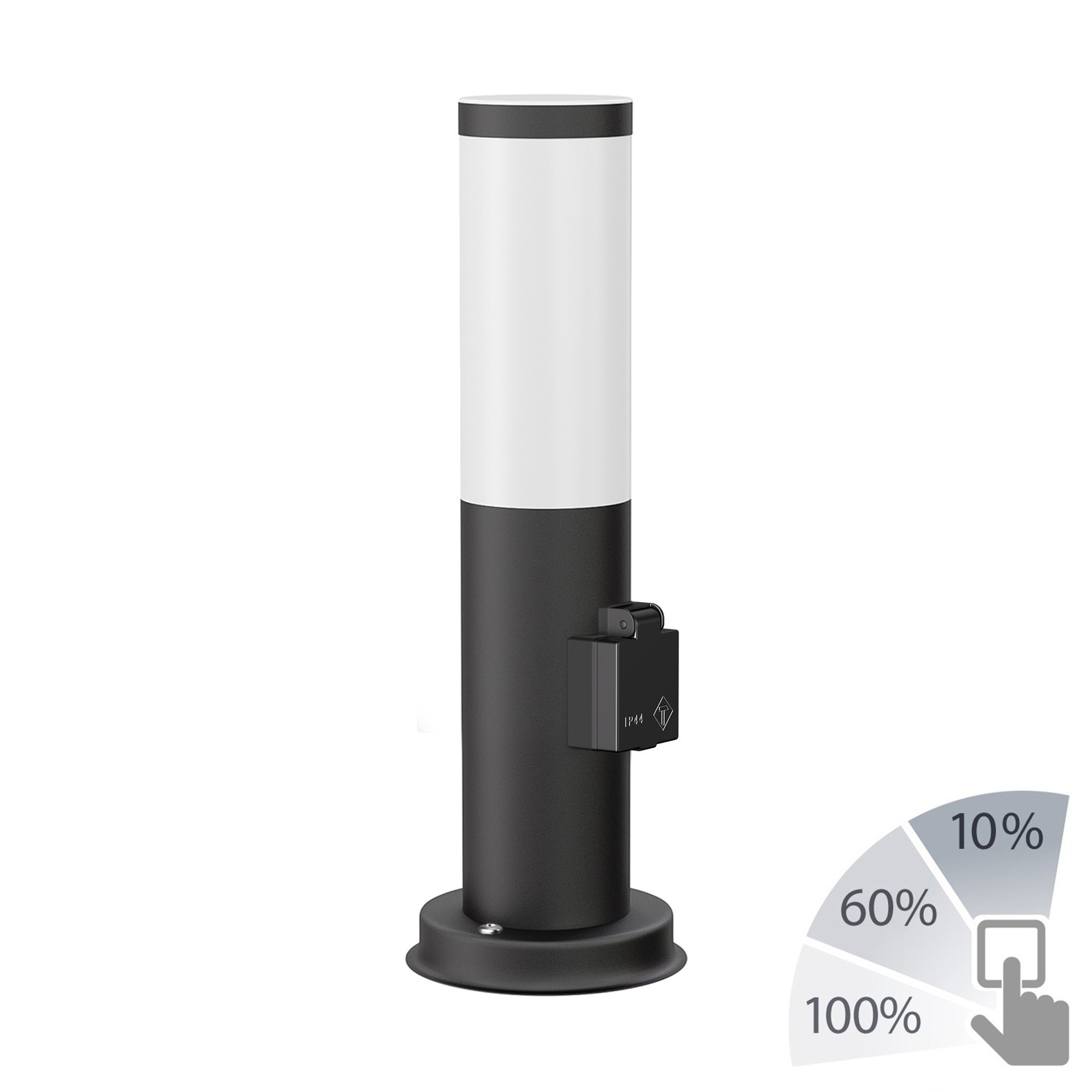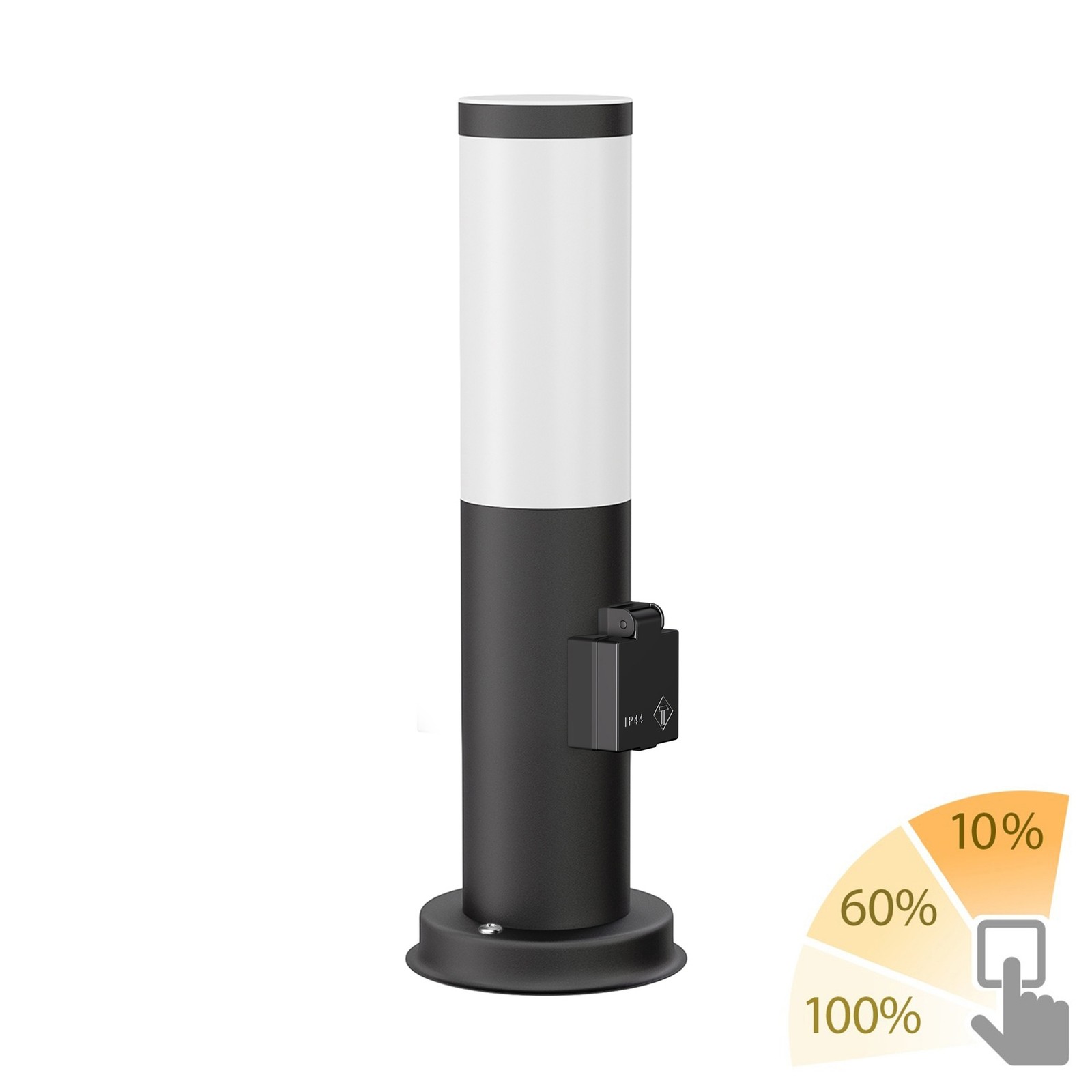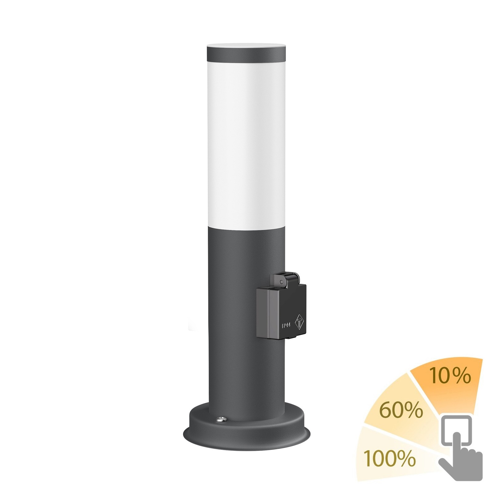 ledscom.de Borne d'éclairage PORU avec prise de courant pour l'extérieur, anthracite, ronde, 38,5cm, ampoule E27 incluse, 471lm, blanc extra-chaud