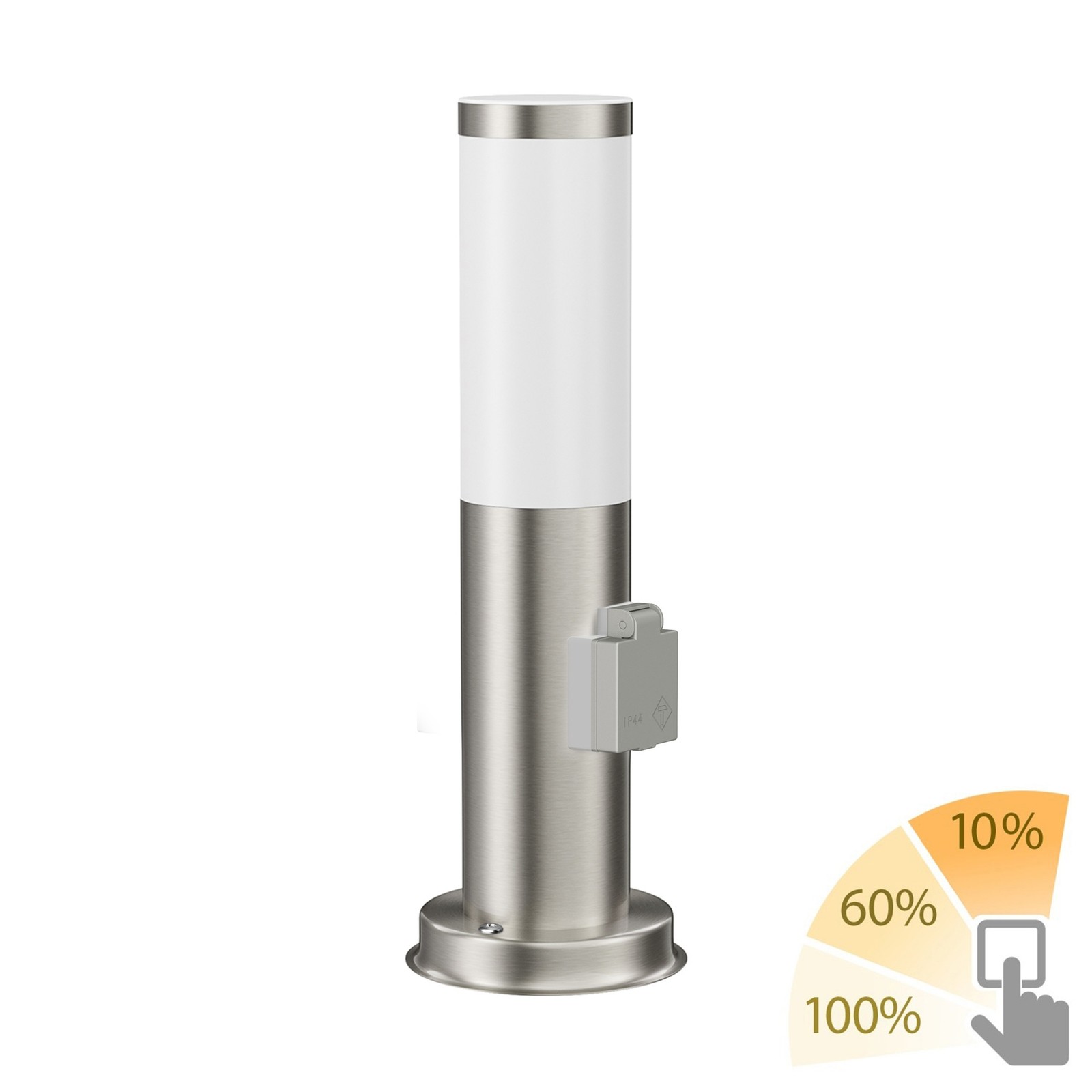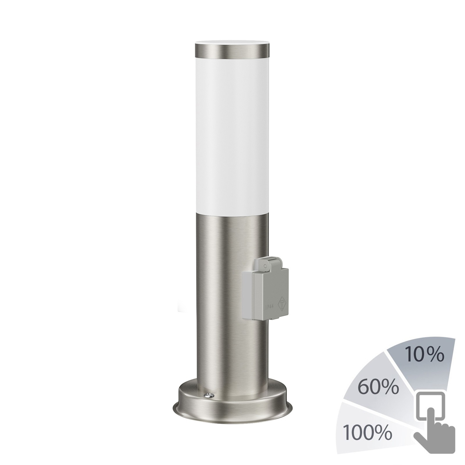 ledscom.de Borne d'éclairage PORU avec prise de courant pour l'extérieur, acier inoxydable, 39 cm, LED E27 incluse, classe d'efficacité énergétique A (blanc chaud, 4W, 935lm)