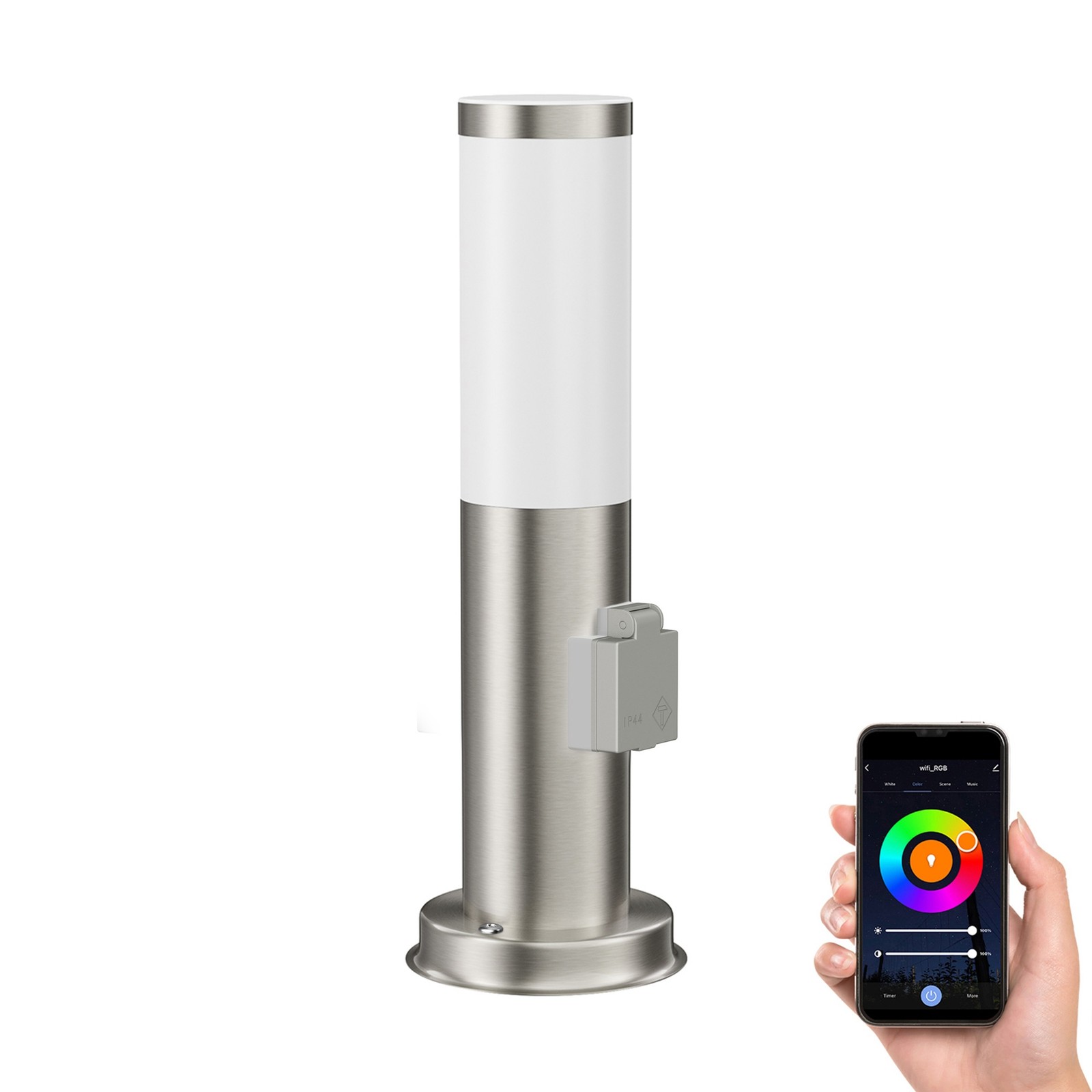 ledscom.de Borne d'éclairage PORU avec prise de courant pour l'extérieur, inox, rond, 38,5cm, incl. Smart Home RGBW E27 lampe LED, 892lm