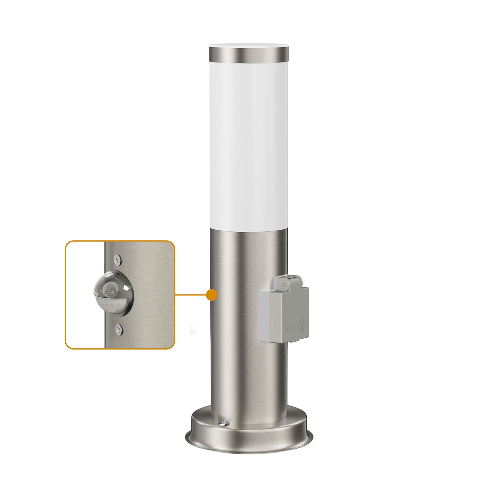 ledscom.de Borne d'éclairage PORU avec prise de courant pour l'extérieur, inox, ronde, 38,5cm, ampoule E27 incluse, 471lm, blanc extra-chaud