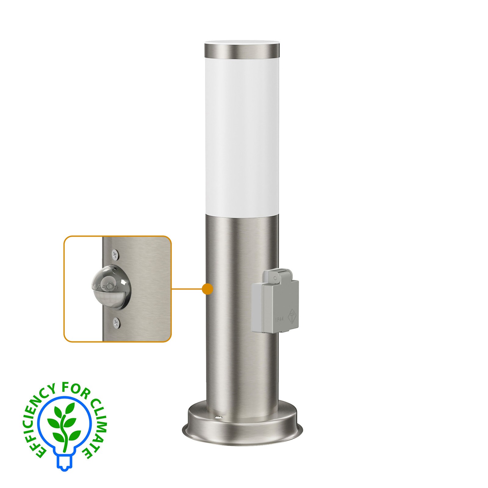 ledscom.de 2 pièces Borne d'éclairage PORU avec prise de courant pour l'extérieur, acier inoxydable, 39 cm, LED E27 incluse, classe d'efficacité énergétique A (blanc chaud, 4W, 935lm)