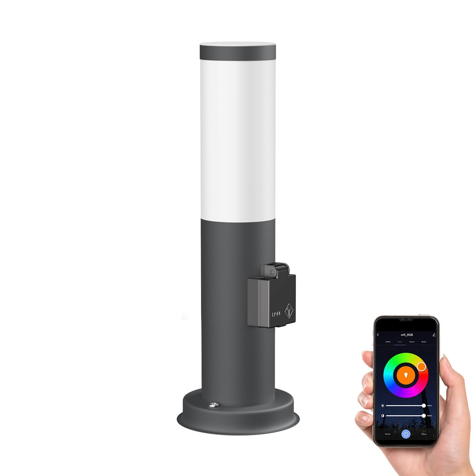 ledscom.de Borne d'éclairage PORU avec prise de courant pour l'extérieur, anthracite, ronde, 38,5cm, ampoule LED Smart Home RGBW E27 incluse, 892lm