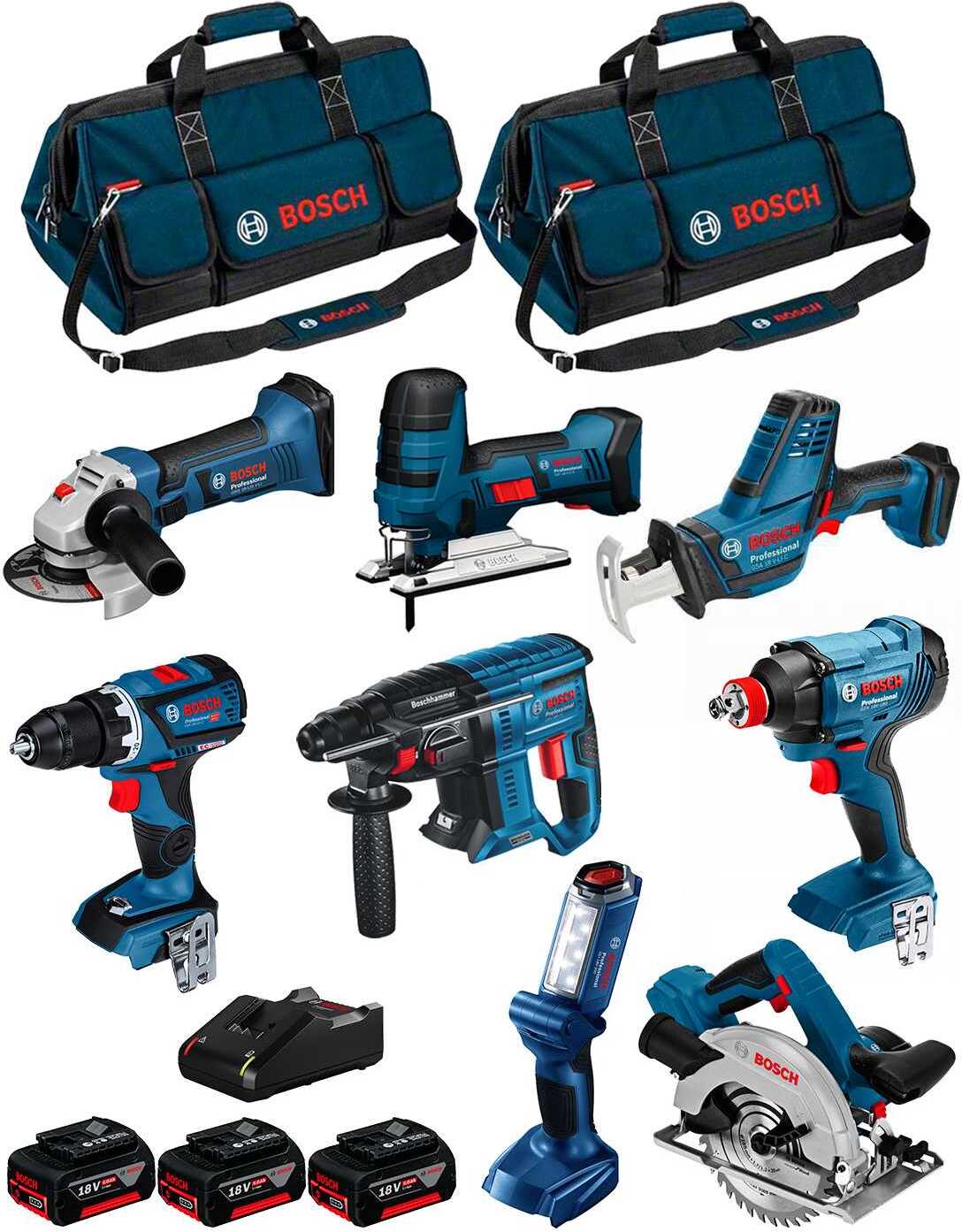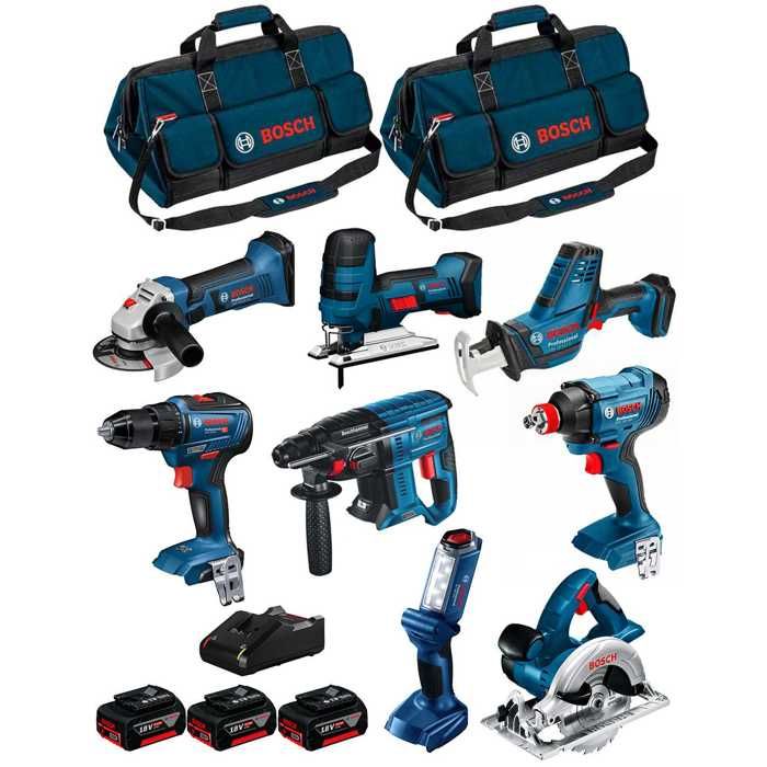 BOSCH Kit 18V BK1002 (GST18V-LIS+GKS18V-LI+GBH18V-21+GWS18-125V-LI+GSR18V-55+GSA18V-LIC+GDX18V-180+GLI18V-300+GHO18V-LI+3x50Ah)