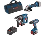 Kit 3 outils BOSCH perceuse GSR 18V-28, perfo GBH 18V-21, meuleuse GWS 18-125 + 2 batt. GBA18V 5.0AH + chargeur GAL1880 + Sac - 0615990M0W