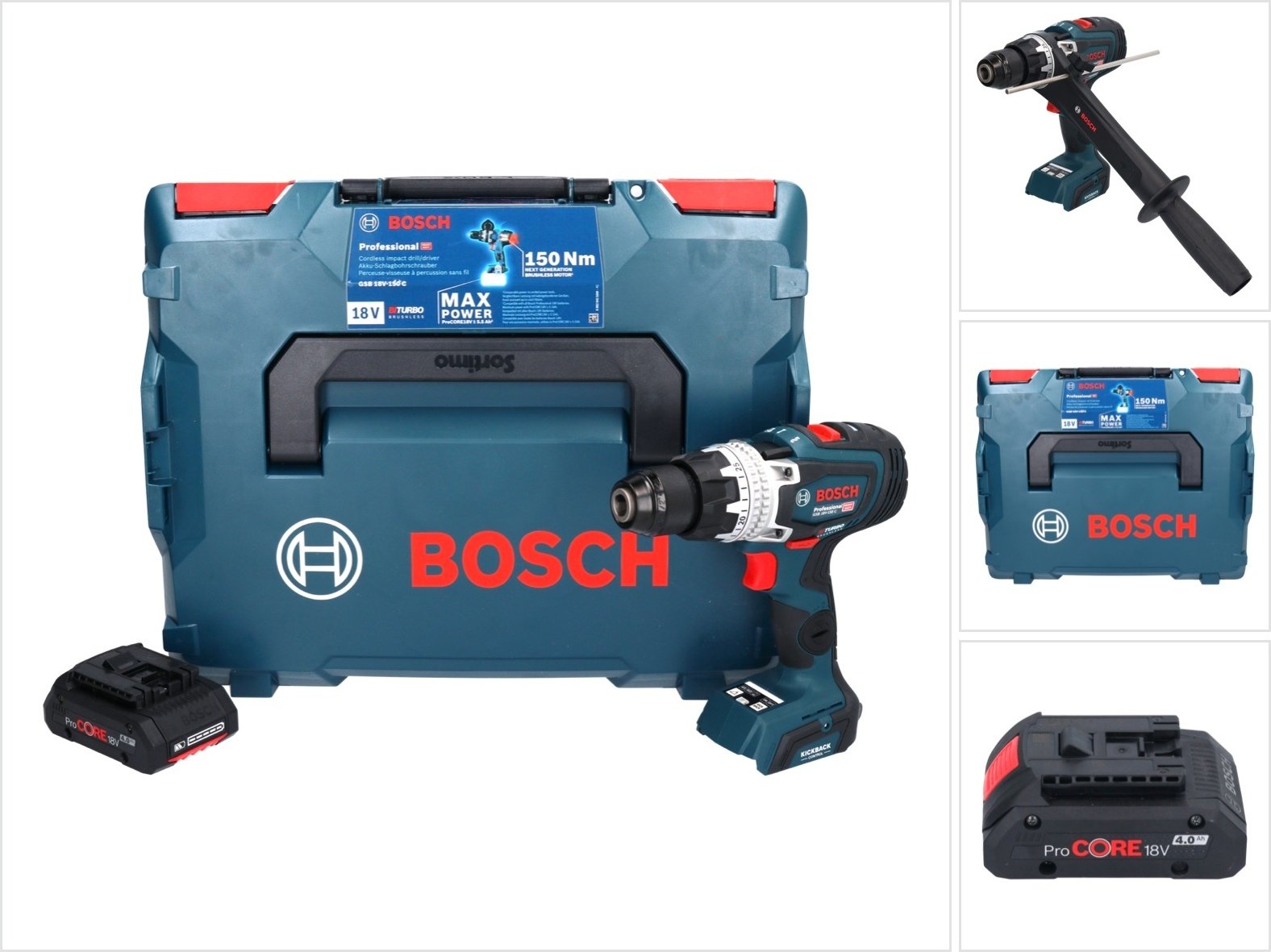 Bosch GSB 18V-150 C Professional Perceuse-visseuse à percussion sans fil 18 V 150 Nm Biturbo Brushless + 1x batterie ProCORE 4,0 Ah + L-Boxx - sans chargeur