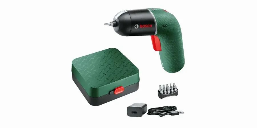 Bosch Visseuse sans fil compacte IXO Flexi Set (7ème génération ; 3,6V ; 2,0Ah ; avec extension flexible et câble micro USB ; pliable à 180° ; 10 embouts) + Bosch Boîte de rangement pour outils