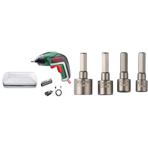 Bosch Home and Garden Visseuse sans Fil - IXO V Edition Classique (Livrée avec Chargeur et 10 Embouts de Vissage, Boîte en Métal) + Assortiment de 4 douilles pour Vis à tête six pans 1/4", 36-38 mm