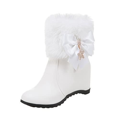 Botte Hiver Femme-Women's Boots — Dames Mode Cuir nœud Strass décoratif Fermeture éclair latérale à l'intérieur Haut Talon compensé Bottes Courtes en Coton (White- 42)