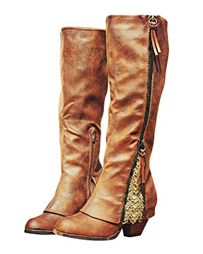 ORANDESIGNE Bottes mi-mollet simili cuir avec dentelle fermeture éclair talon carré vintage cowboy femme chameau 42 EU
