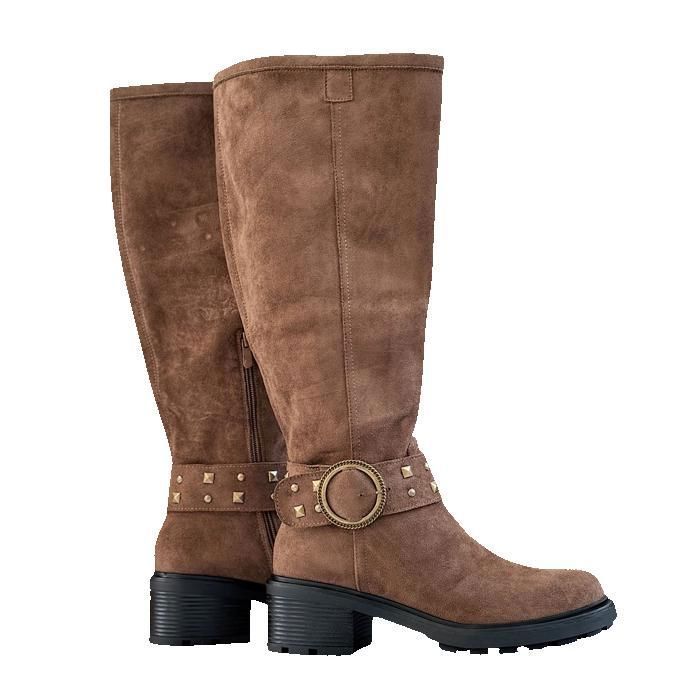 Bottes femme pour mollet large CARMELYNA - Bottes hautes en daim taupe à boucle doré