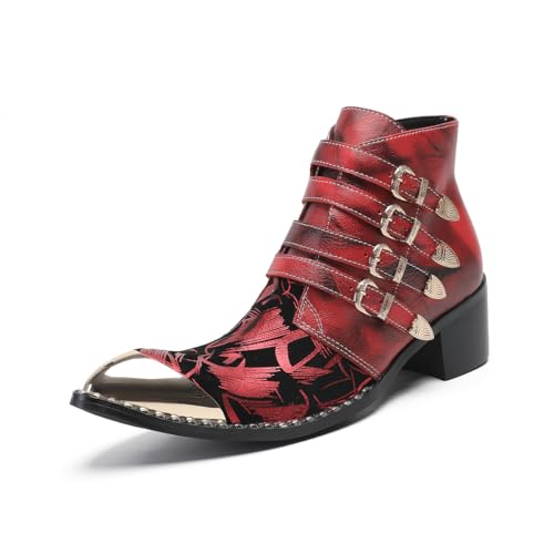 Yhsdfcn Bottines Habillées Rouges pour Homme en Cuir - Boots de Ville à Quatre Boucles avec Bout Métallique et Motif Graphique,Rouge,39 EU