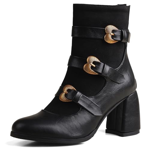 Lroey Reoly Bottines À Talon Bloc Femme, Bottes Cowboy Mode Zip Bottes Courtes Talons Hauts Pointu Bottines 431 Noir Taille 35 EU