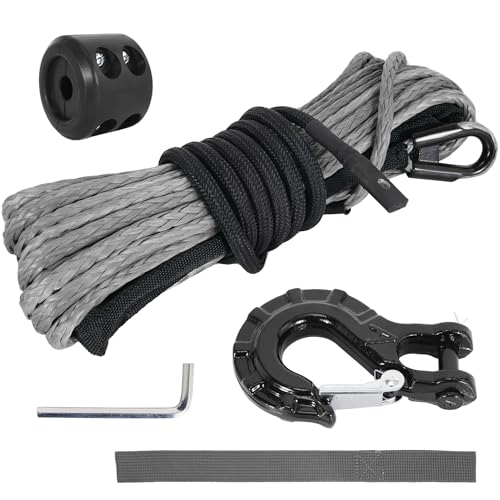 RUHUO Kit de Câble de Treuil Synthétique, 3/16"x50' Câble de Treuil Avec Manchon Protecteur, Crochet Treuil Renforcé et Bouchon En Caoutchouc, Accessoires Treuil Pour (Noir et Gris, 3/16"x50')