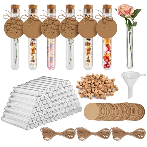 OFFCUP Lot de 100 Tubes à Essai, Tube à Essai avec Bouchon en Liège, Eprouvette Plastique Transparent avec 100Étiquettes 1 Entonnoirs 30mCorde de Chanvre pour Plante Bonbons Epice Echantillon 16*100mm