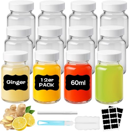 Ferenando 12 Petite Bouteilles en Verre Réutilisables de 60ml/2oz de Jus avec Bouchon Hermétique, Étiquettes & Brosse, Mini Bouteille Verre Portable pour Jus de Fruits, Jus de Gingembre et Whisky