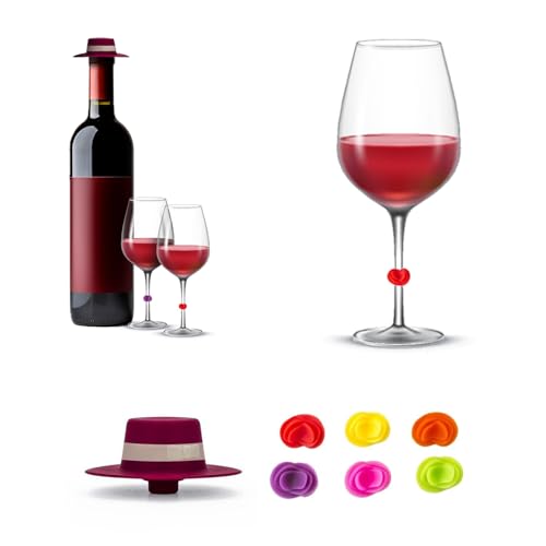 Avilia Set bouchon en silicone pour bouteille en verre de vin ou de champagne avec 6 marques de verres en bois colorés, idéal pour les fêtes amusantes et les occasions spéciales. Excellent également