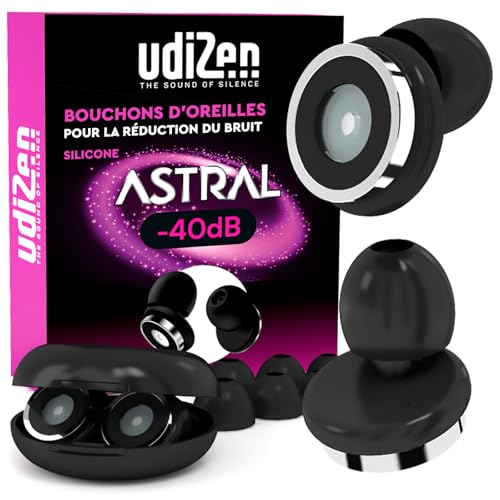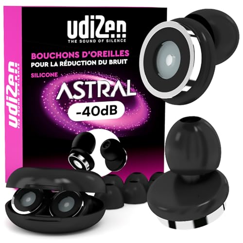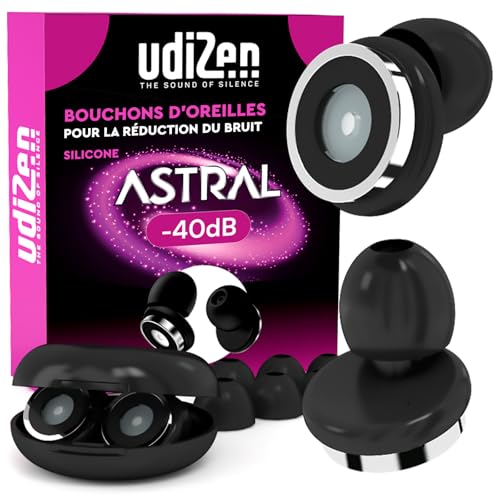Bouchons d'Oreilles Antibruit pour Dormir Voyager Étudier -40dB UdiZen Astral Réduction du Bruit - 1 Paire de Bouchons Ergonomiques Réutilisables Protection Auditive SNR 40dB Couleur Noire avec Étui