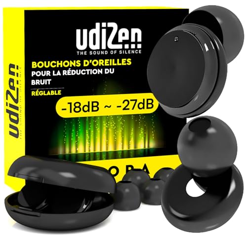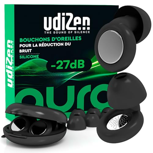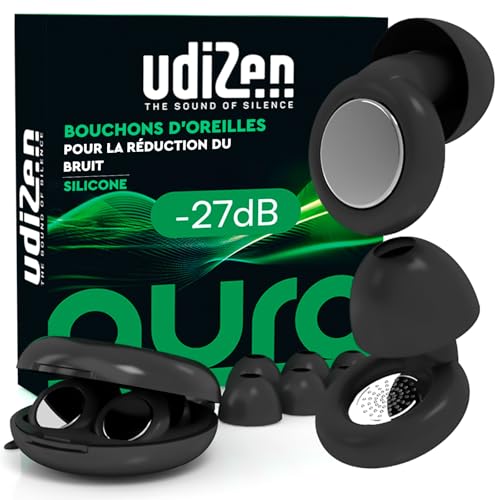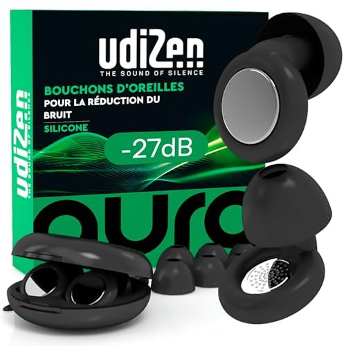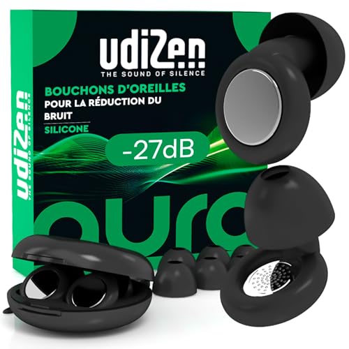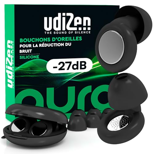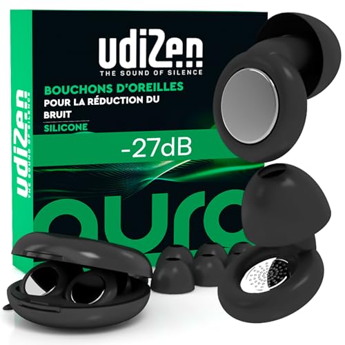 Bouchons d'Oreilles Antibruit pour Dormir Voyager Étudier -27dB UdiZen Aura Réduction du Bruit - 1 Paire de Bouchons Ergonomiques Réutilisables Protection Auditive SNR 27dB Couleur Noire avec Étui
