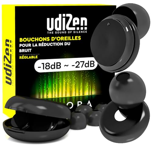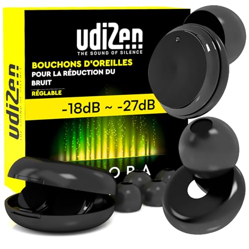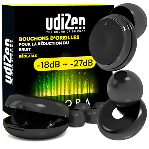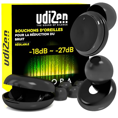 Bouchons d'Oreilles Antibruit pour Dormir Voyager Étudier -18dB ~ -27dB UdiZen Aurora Réduction du Bruit - 1 Paire de Bouchons Ergonomiques Réutilisables Protection Auditive SNR Réglable avec Étui