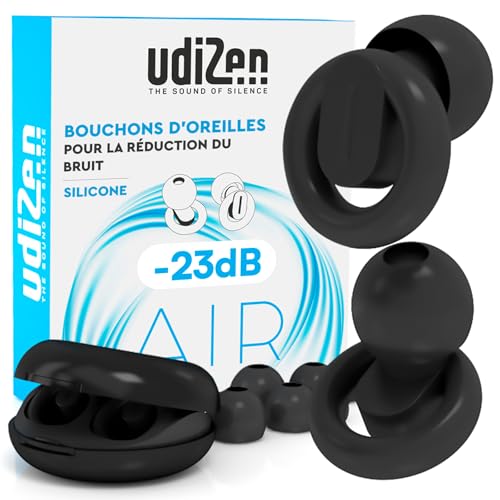 Bouchons d'Oreilles Antibruit pour Dormir Voyager Étudier -23dB UdiZen Air Réduction du Bruit - 1 Paire de Bouchons Ergonomiques Réutilisables Protection Auditive SNR 23dB Couleur Noire avec Étui