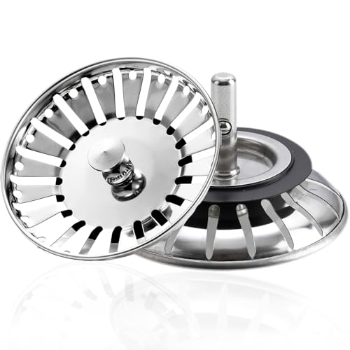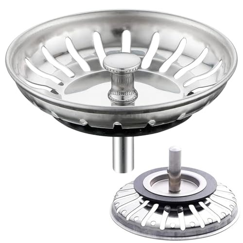 Lot de 2 bouchons d'évier de cuisine - Filtre de lavabo - Panier de rechange - Panier en acier inoxydable avec bouton - Bouchon en caoutchouc en bas Delr