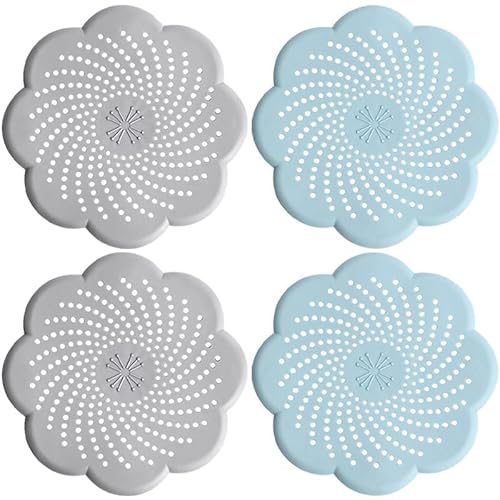 Vmoomax Lot de 4 Tamis Évacuation Silicone Universels avec Ventouses, Attrape Cheveux Douche et Baignoire, Filtre Anti-Bouchons pour Évier Cuisine et Salle de Bain, 2 Gris + 2 Bleus