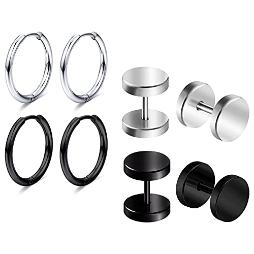 Funseedrr 3-4 Paires Boucle d'oreille Homme Clous d'oreilles Clip Acier Inoxydable Faux Bouchon Tunnels Piercing Oreille Argent Noir